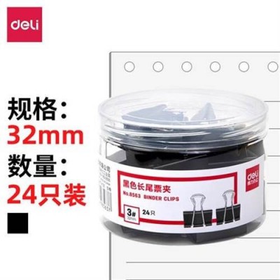 得力 8563 3#黑色长尾票夹32mm(筒装)(黑)(24只/筒)SKU:YJ002091